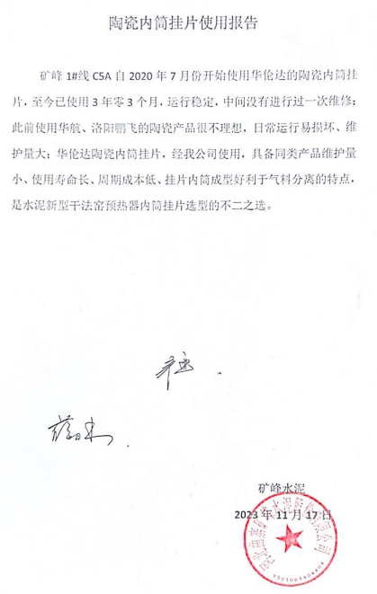 礦峰水泥1#線C5A自2020年7月份開始使用江蘇凱達(dá)的納米復(fù)合高強(qiáng)度陶瓷內(nèi)筒掛片,至今已使用3年零3個月,運(yùn)行穩(wěn)定,中間沒有進(jìn)行過一次維修。此前使用市場上長條形陶瓷產(chǎn)品很不理想,使用效果不好,日常運(yùn)行易損壞、維護(hù)量大。