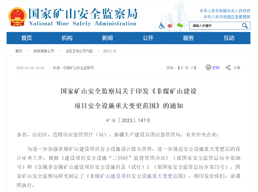 日前,國家礦山安全監(jiān)察局關(guān)于印發(fā)《非煤礦山建設(shè)項目安全設(shè)施重大變更范圍》的通知給各省、自治區(qū)、直轄市應(yīng)急管理廳(局),新疆生產(chǎn)建設(shè)兵團應(yīng)急管理局,有關(guān)中央企業(yè)。