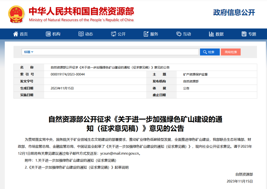 同期,自然資源部發(fā)布自然資源部公開征求《關(guān)于進一步加強綠色礦山建設(shè)的通知(征求意見稿)》意見的公告。