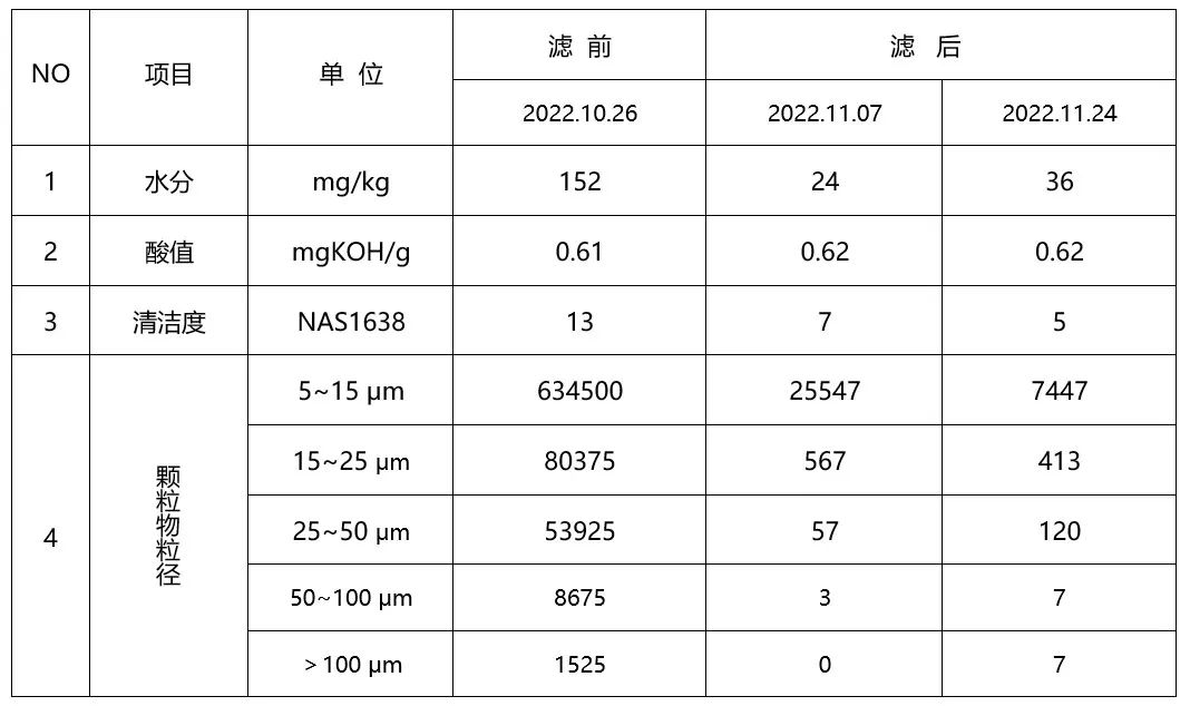 加裝納米級超精油品過濾系統(tǒng)后,僅10天左右水分便大幅下降。1個月后清潔度降至 NAS5級,且酸值穩(wěn)定、油品品質(zhì)大幅上升。目前已使用近一年,系統(tǒng)加裝前原來每隔兩、三個月就要頻繁維修的液壓泵再未出現(xiàn)異常,綜合運維成本和計劃外停機大幅減少。