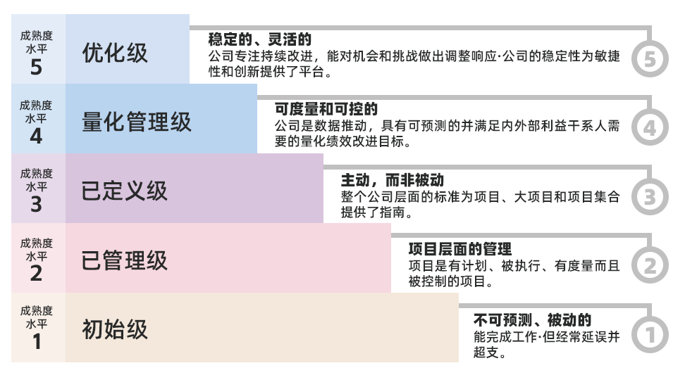 ▲ CMMI的5個(gè)級別及標(biāo)準(zhǔn)