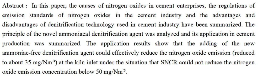 本文概述了氮氧化物在水泥企業(yè)產(chǎn)生的原因和各個(gè)地區(qū)對(duì)水泥行業(yè)氮氧化物排放標(biāo)準(zhǔn)的規(guī)定,以及目前水泥行業(yè)采用的脫硝技術(shù)的優(yōu)缺點(diǎn)。分析了新型無(wú)氨脫硝劑的原理,并對(duì)新型無(wú)氨脫硝劑在水泥生產(chǎn)中的應(yīng)用進(jìn)行了總結(jié)分析。應(yīng)用結(jié)果表明,在SNCR無(wú)法將氮氧化物排放濃度控制在50mg/Nm³以下時(shí),添加新型無(wú)氨脫硝劑后,能夠有效降低窯尾氮氧化物的排放,并能降低至30mg/Nm³以?xún)?nèi)。