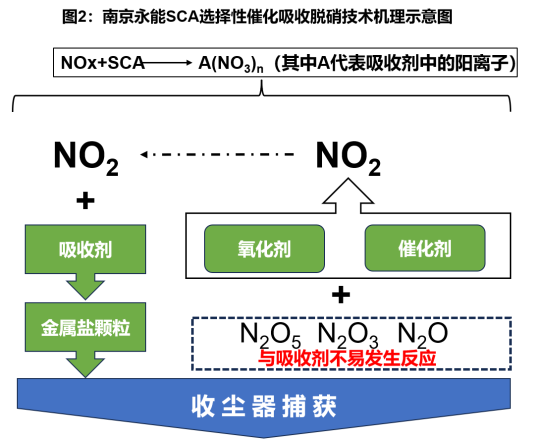 南京永能新材料有限公司開(kāi)發(fā)了SCA(selective catalyst abosorption)選擇性催化吸收脫硝技術(shù)。該液體脫硝劑可以在SNCR、SCR等脫硝系統(tǒng)后端進(jìn)行輔助脫硝,無(wú)氨基,可以降低水泥企業(yè)氨水單耗和氨逃逸指標(biāo)。無(wú)氨脫硝劑的主要成分包括:催化劑、分散劑、吸收劑、氧化劑組成成。通過(guò)特定催化劑的協(xié)同作用,高價(jià)態(tài)的NO2很容易被吸收劑轉(zhuǎn)化為穩(wěn)定的硝酸鹽而固定,而NO則難以被吸收,即便被吸收也容易重新分解為NOx組分。永能公司的無(wú)氨脫硝劑中的氧化劑主要提供氧源,通過(guò)催化劑協(xié)同作用,可將氣態(tài)NOx快速且定向轉(zhuǎn)化為NO2,隨后通過(guò)吸收劑將其轉(zhuǎn)為穩(wěn)定的硝酸鹽,從而實(shí)現(xiàn)尾氣中NOx的高效去除。分散劑的主要作用是為了增加氧化劑與催化劑的溶解度,提高NOx向硝酸鹽的轉(zhuǎn)化效率。最終,生成的硝酸鹽顆粒會(huì)在收塵環(huán)節(jié)被捕捉,從而達(dá)到脫硝的目的。其反應(yīng)機(jī)理圖如下所示:
