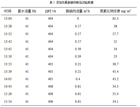 ?、跇悠吩囼?yàn):13:04開(kāi)始進(jìn)行試驗(yàn),試驗(yàn)期間盡量保證氨水用量不變,基本能將氮氧化物排放數(shù)值穩(wěn)定在55mg/m³,期間窯臺(tái)時(shí)為404t/h。13:28在以0.57m³/h的流量,加入南京永能無(wú)氨脫硝劑,窯臺(tái)時(shí)不變,能將氮氧化物排放數(shù)值持續(xù)穩(wěn)定在38mg/m³左右,在13:42分,氮氧化物排放數(shù)值下降至35mg/m³,降低脫硝劑流量至0.39m³/h,13:45分,氮氧化物排放數(shù)值上升至44mg/m³。