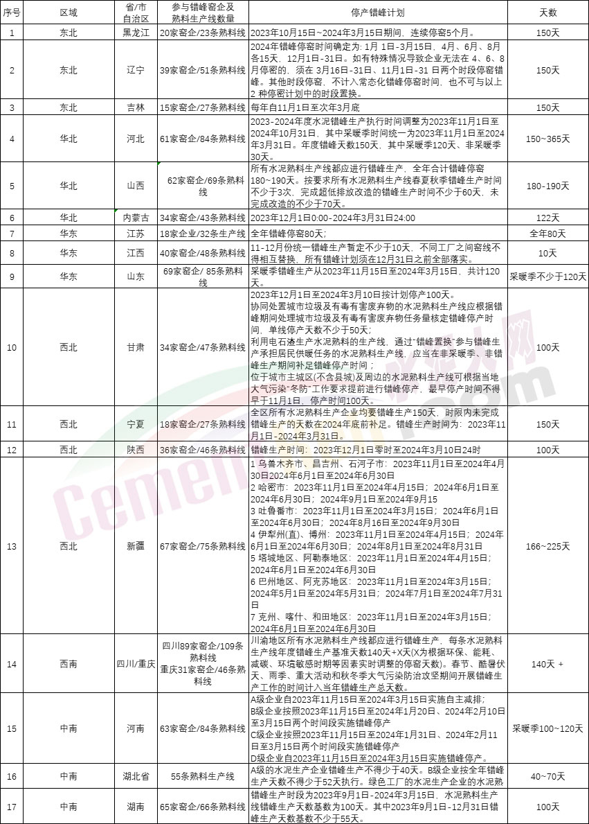 據(jù)水泥人網(wǎng)不完全統(tǒng)計,此前發(fā)布采暖季錯峰生產(chǎn)計劃的省市地區(qū)中有個省市地區(qū)采暖季錯峰生產(chǎn)截至3月末,涉及518家企業(yè),661條水泥熟料生產(chǎn)線。