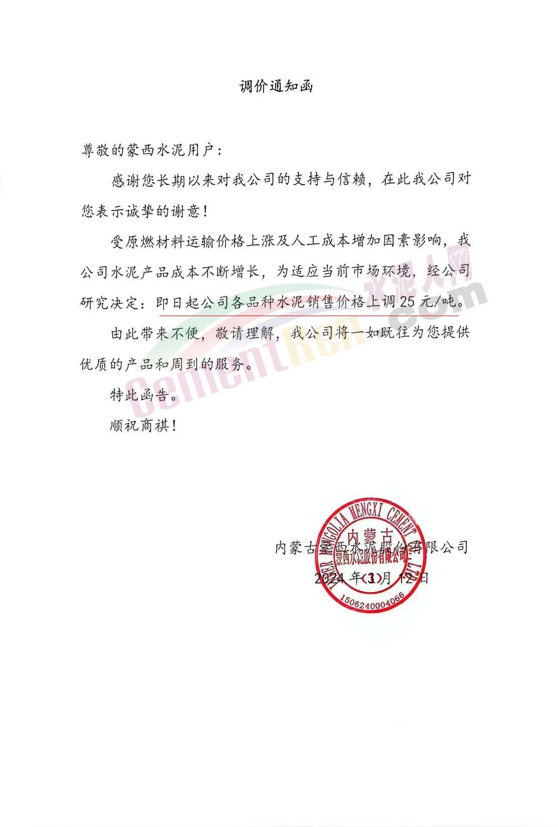 內(nèi)蒙古蒙西水泥股份有限公司通知,受原燃材料運(yùn)輸價(jià)格上漲及人工成本增加因素影響,公司水泥產(chǎn)品成本不斷增長,為適應(yīng)當(dāng)前市場(chǎng)環(huán)境,經(jīng)公司研究決定:即日起公司各品種水泥銷售價(jià)格上調(diào)25元/噸。