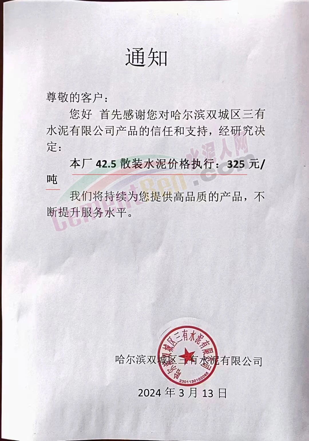 哈爾濱雙城區(qū)三有水泥有限公司3月13日通知,本廠42.5散裝水泥價(jià)格執(zhí)行325元/噸。