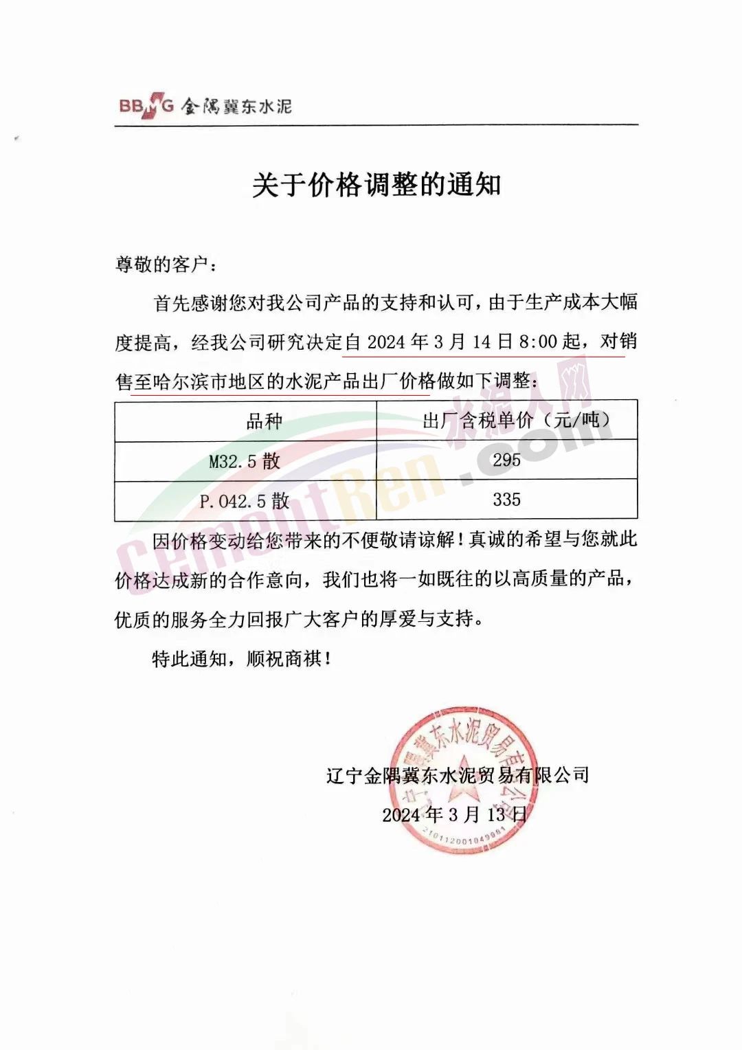 遼寧金隅冀東水泥貿(mào)易有限公司通知,自2024年3月14日8:00起,對(duì)銷售至哈爾濱市地區(qū)的水泥產(chǎn)品出廠價(jià)格做調(diào)整:調(diào)整后M32.5散出廠含稅單價(jià)295元/噸,P.O42.5散出廠含稅單價(jià)335元/噸。