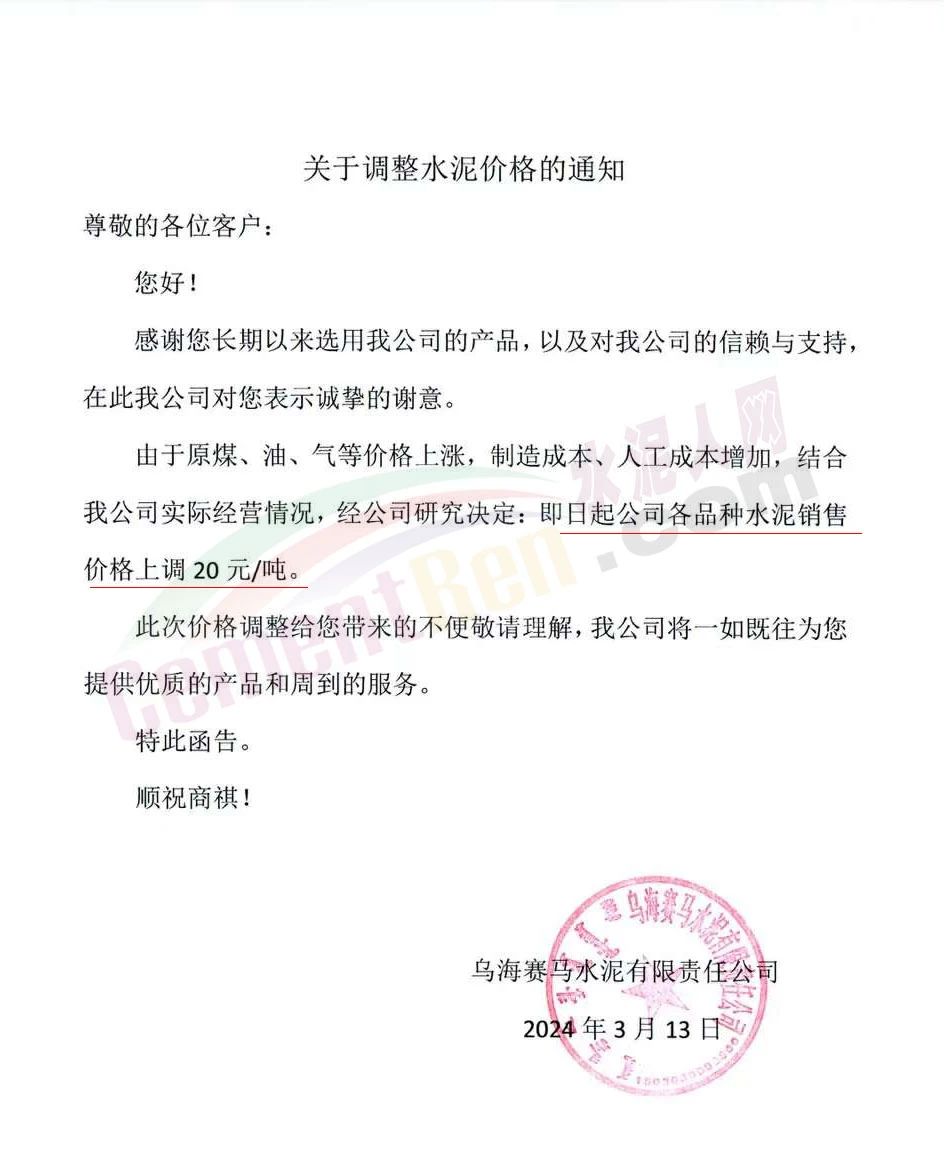 烏海賽馬水泥有限責(zé)任公司通知,由于原煤、油、氣等價(jià)格上漲,制造成本、人工成本增加,結(jié)合公司實(shí)際經(jīng)營情況,經(jīng)公司研究決定:即日起公司各品種水泥銷售價(jià)格上調(diào)20元/噸。