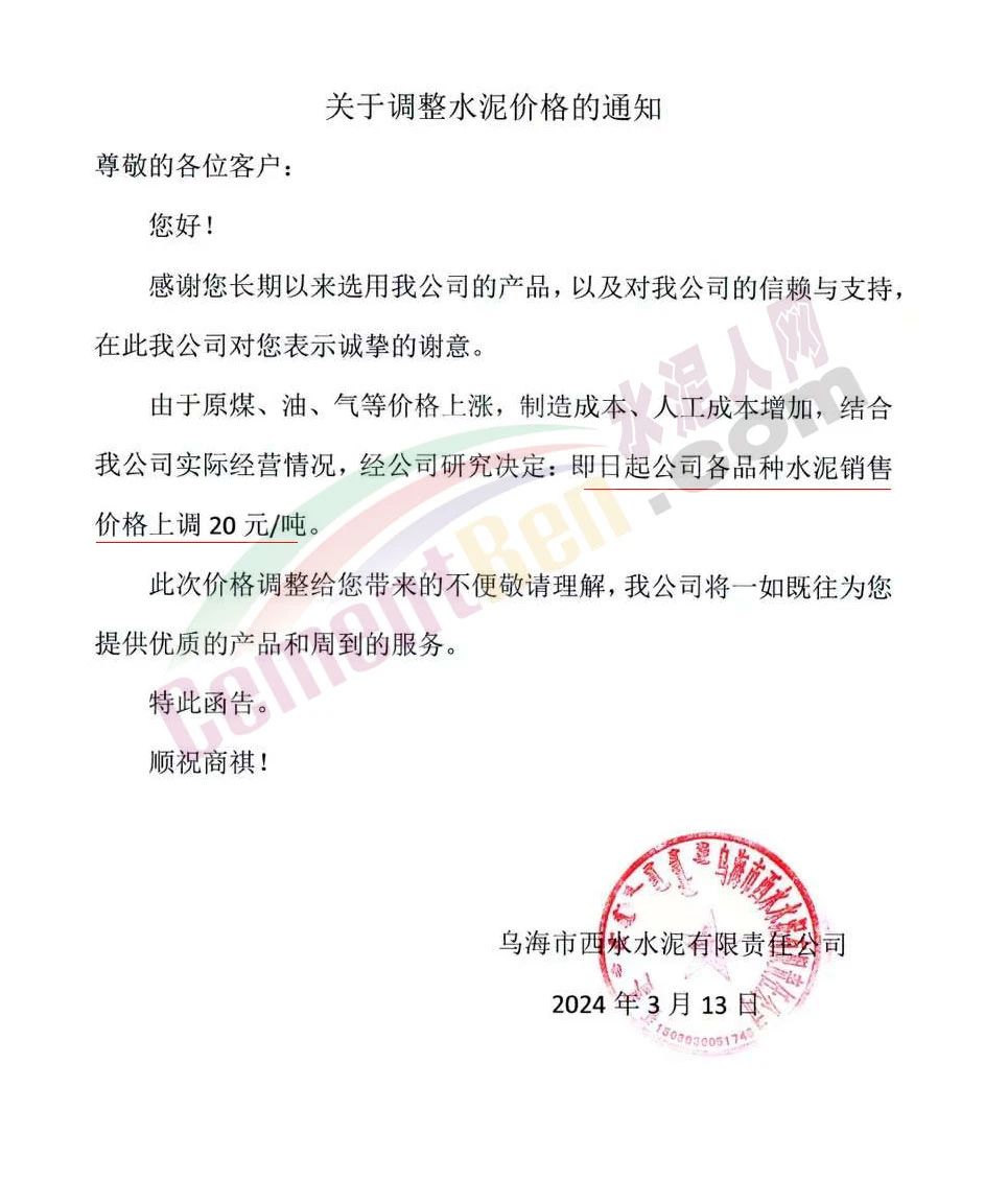 鄂爾多斯市清能新材料有限公司通知,結(jié)合目前的水泥市場(chǎng),經(jīng)公司研究決定,自2024年3月14日起,P.C42.5、P.O42.5R水泥出廠含稅價(jià)上調(diào)20元/噸。