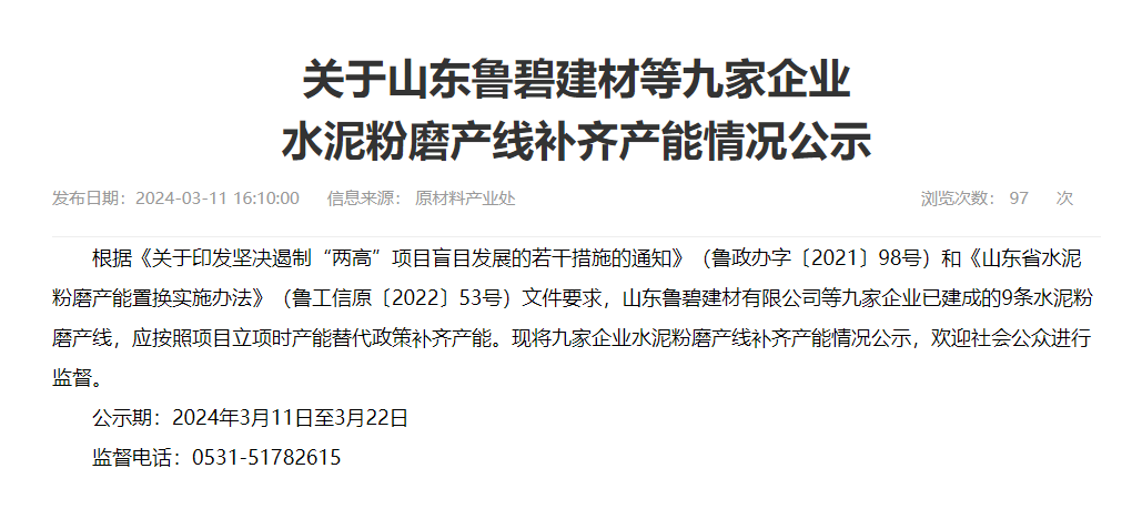 日前,山東省工信廳發(fā)布《關(guān)于山東魯碧建材等九家企業(yè)水泥粉磨產(chǎn)線補(bǔ)齊產(chǎn)能情況公示》稱,根據(jù)《關(guān)于印發(fā)堅(jiān)決遏制“兩高”項(xiàng)目盲目發(fā)展的若干措施的通知》(魯政辦字〔2021〕98號)和《山東省水泥粉磨產(chǎn)能置換實(shí)施辦法》(魯工信原〔2022〕53號)文件要求,山東魯碧建材有限公司等九家企業(yè)已建成的9條水泥粉磨產(chǎn)線,應(yīng)按照項(xiàng)目立項(xiàng)時產(chǎn)能替代政策補(bǔ)齊產(chǎn)能?,F(xiàn)將九家企業(yè)水泥粉磨產(chǎn)線補(bǔ)齊產(chǎn)能情況公示,歡迎社會公眾進(jìn)行監(jiān)督。公示期:2024年3月11日至3月22日,監(jiān)督電話:0531-51782615