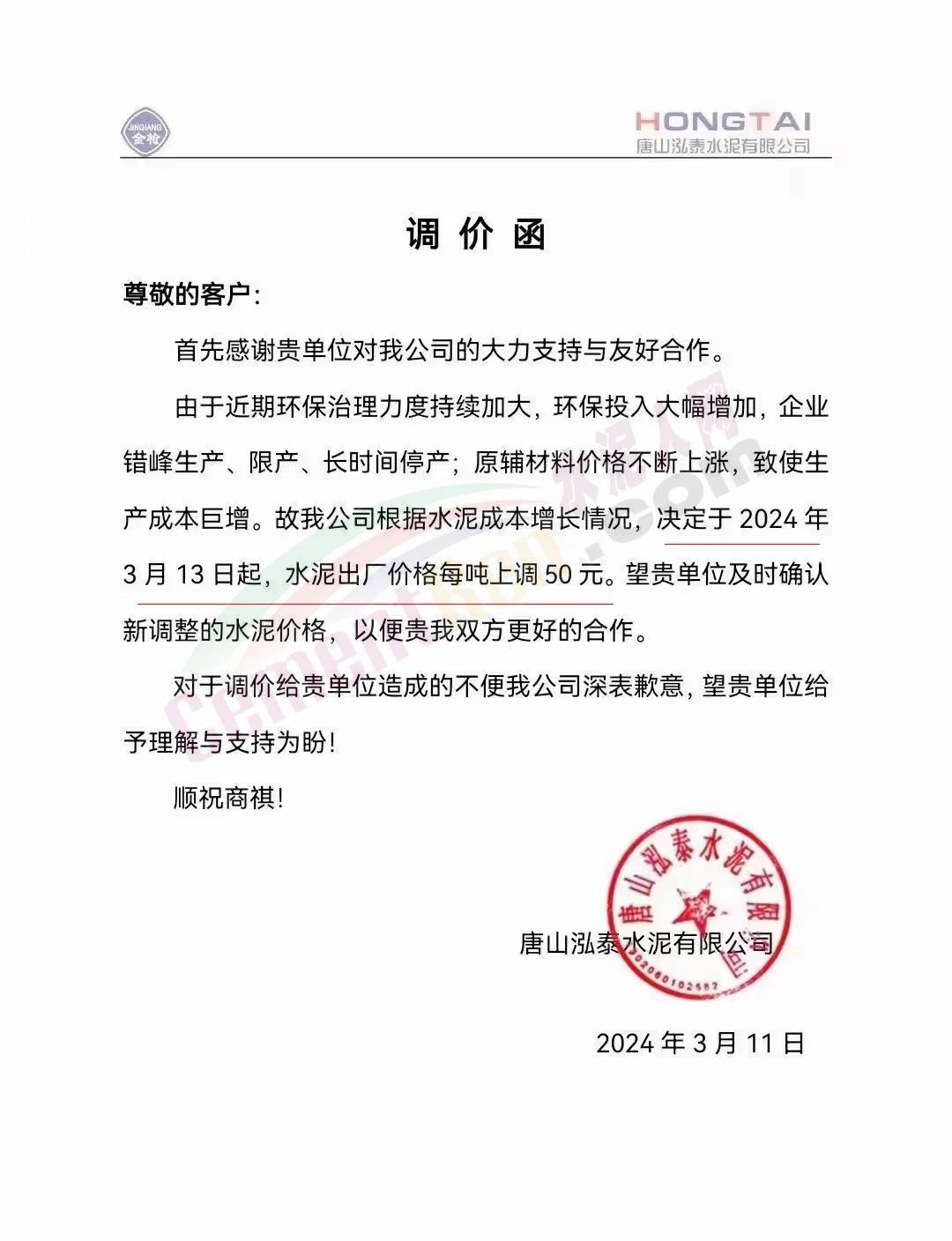 唐山泓泰水泥有限公司通知,由于近期環(huán)保治理力度持續(xù)加大,環(huán)保投入大幅增加,企業(yè)錯峰生產(chǎn)、限產(chǎn)、長時間停產(chǎn);原輔材料價格不斷上漲,致使生產(chǎn)成本巨增。故公司根據(jù)水泥成本增長情況,決定于2024年3月13日起,水泥出廠價格每噸上調(diào)50元。