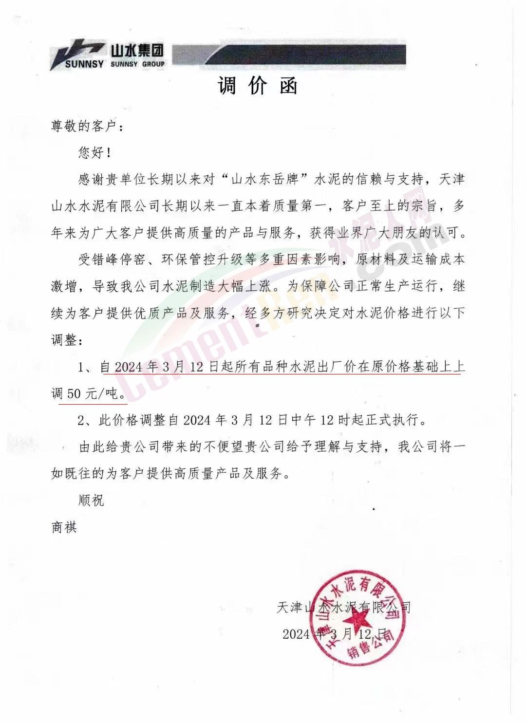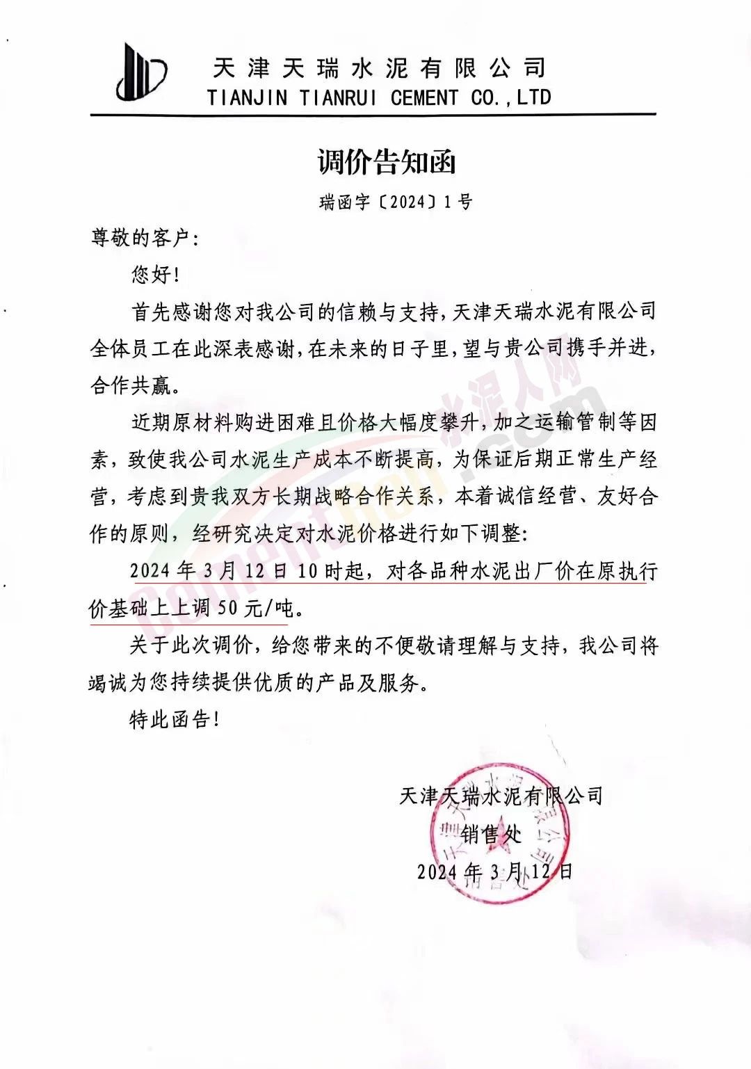 天津天瑞水泥有限公司通知,近期原材料購進(jìn)困難且價格大幅度攀升,加之運輸管制等因素,致使公司水泥生產(chǎn)成本不斷提高,經(jīng)研究決定2024年3月12日10時起,對各品種水泥出廠價在原執(zhí)行價基礎(chǔ)上上調(diào)50元/噸。