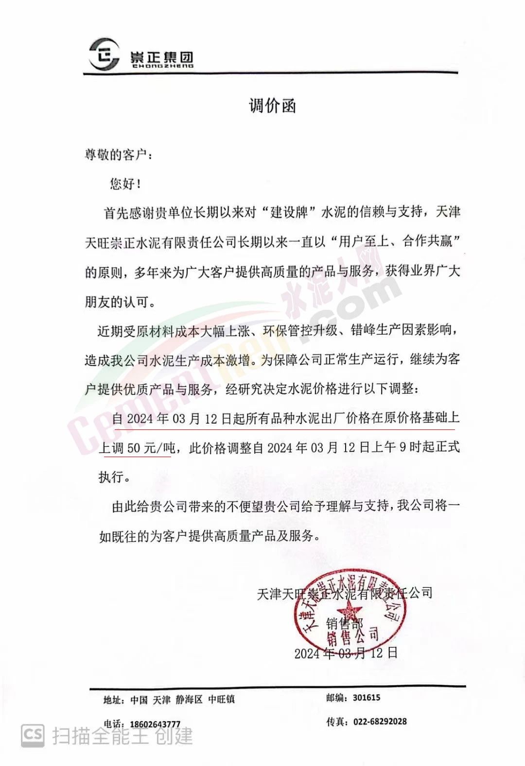 天津天旺崇正水泥有限責(zé)任公司通知近期受原材料成本大幅上漲、環(huán)保管控升級、錯峰生產(chǎn)因素影響,造成公司水泥生產(chǎn)成本激增。經(jīng)研究決定,自2024年3月12日起所有品種水泥出廠價格在原價格基礎(chǔ)上上調(diào)50元/噸。