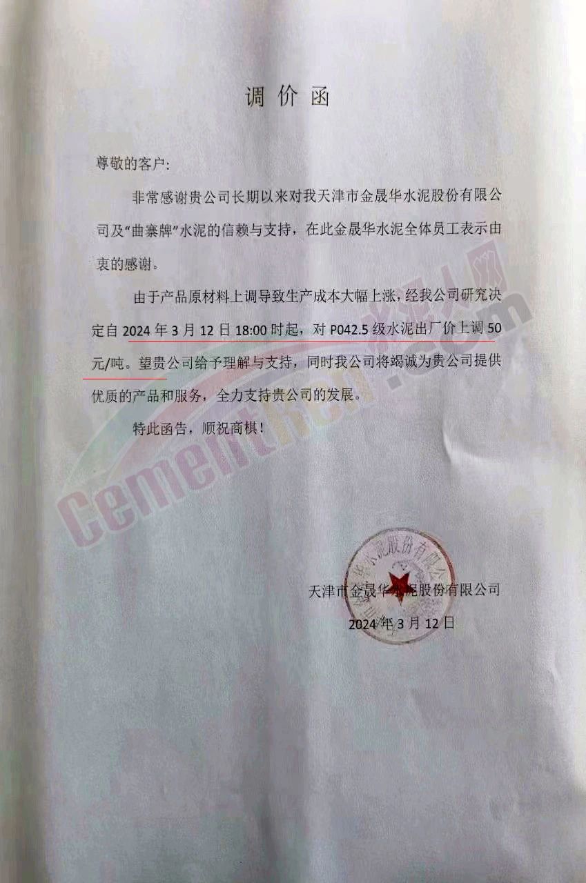 天津市金晟華水泥股份有限公司通知,由于產(chǎn)品原材料上調(diào)導(dǎo)致生產(chǎn)成本大幅上漲,經(jīng)公司研究決定自2024年3月12日18:00時起,對PO42.5級水泥出廠價上調(diào)50元/噸。