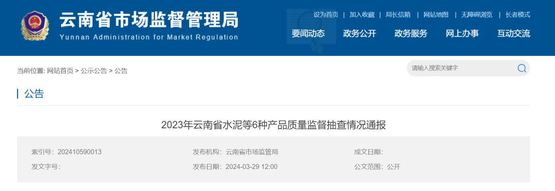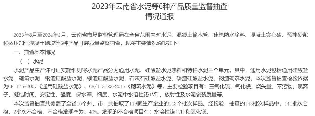 日前,云南省市場監(jiān)管局發(fā)布《2023年云南省水泥等6種產(chǎn)品質量監(jiān)督抽查情況通報》稱,2023年8月至2024年2月,云南省市場監(jiān)督管理局在全省范圍內對水泥、混凝土輸水管、建筑防水涂料、混凝土實心磚、預拌砂漿和蒸壓加氣混凝土砌塊等6種產(chǎn)品開展質量監(jiān)督抽查。