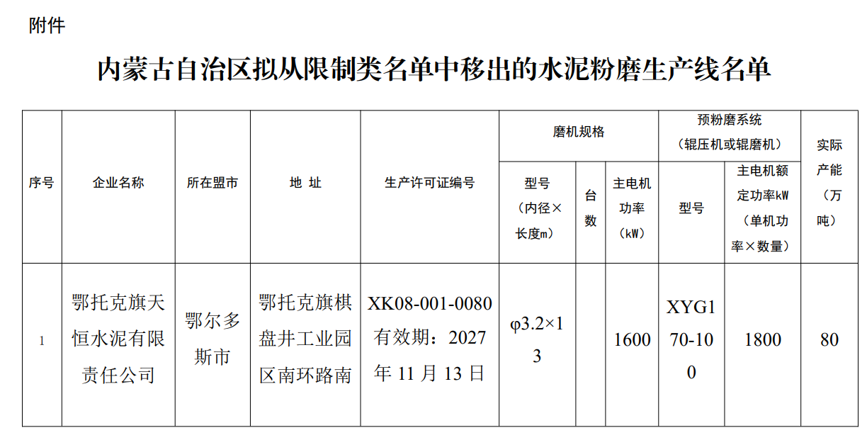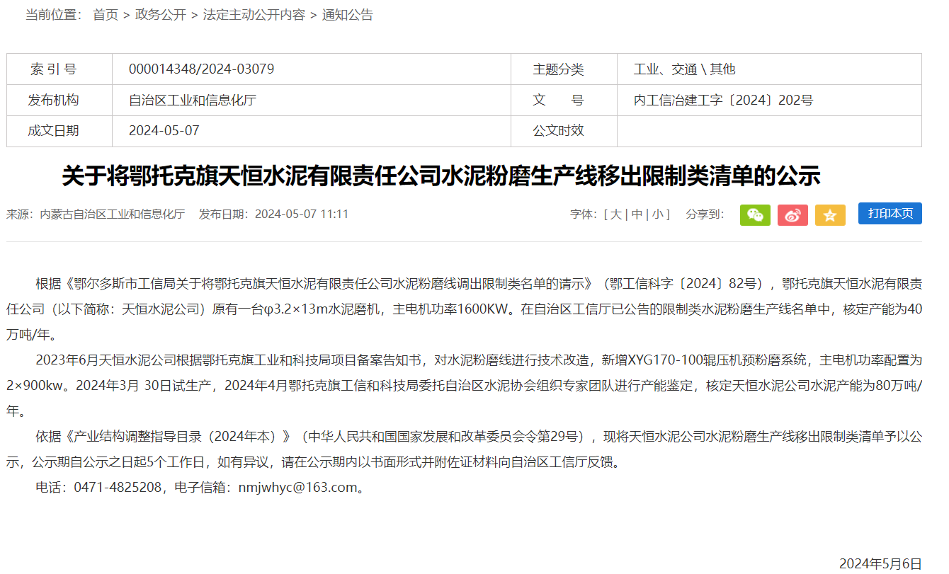 依據(jù)《產(chǎn)業(yè)結(jié)構(gòu)調(diào)整指導(dǎo)目錄(2024年本)》(中華人民共和國國家發(fā)展和改革委員會(huì)令第29號(hào)),現(xiàn)將天恒水泥公司水泥粉磨生產(chǎn)線移出限制類清單予以公示,公示期自公示之日起5個(gè)工作日,如有異議,請?jiān)诠酒趦?nèi)以書面形式并附佐證材料向自治區(qū)工信廳反饋。