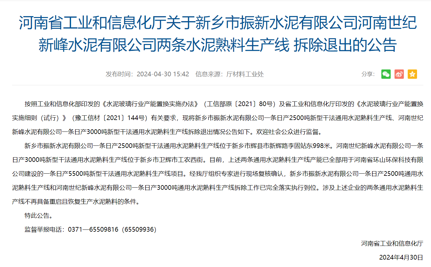 日前,河南省工信廳發(fā)布關(guān)于新鄉(xiāng)市振新水泥有限公司、河南世紀(jì)新峰水泥有限公司兩條水泥熟料生產(chǎn)線拆除退出的公告。