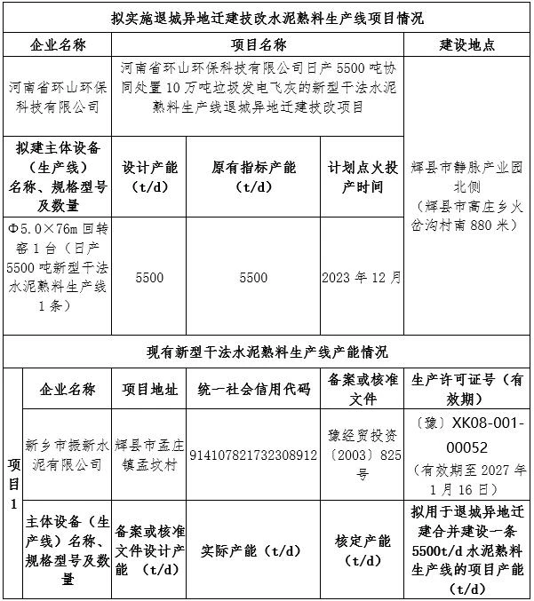 新鄉(xiāng)市振新水泥有限公司一條日產(chǎn)2500噸新型干法通用水泥熟料生產(chǎn)線位于新鄉(xiāng)市輝縣市新輝路李固站東998米。河南世紀(jì)新峰水泥有限公司一條日產(chǎn)3000噸新型干法通用水泥熟料生產(chǎn)線位于新鄉(xiāng)市衛(wèi)輝市工農(nóng)西街。目前,上述兩條通用水泥熟料生產(chǎn)線產(chǎn)能已全部用于河南省環(huán)山環(huán)??萍加邢薰窘ㄔO(shè)的一條日產(chǎn)5500噸新型干法通用水泥熟料生產(chǎn)線項(xiàng)目。