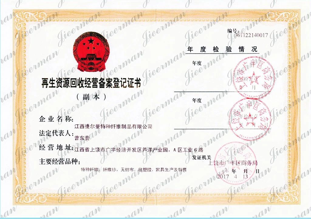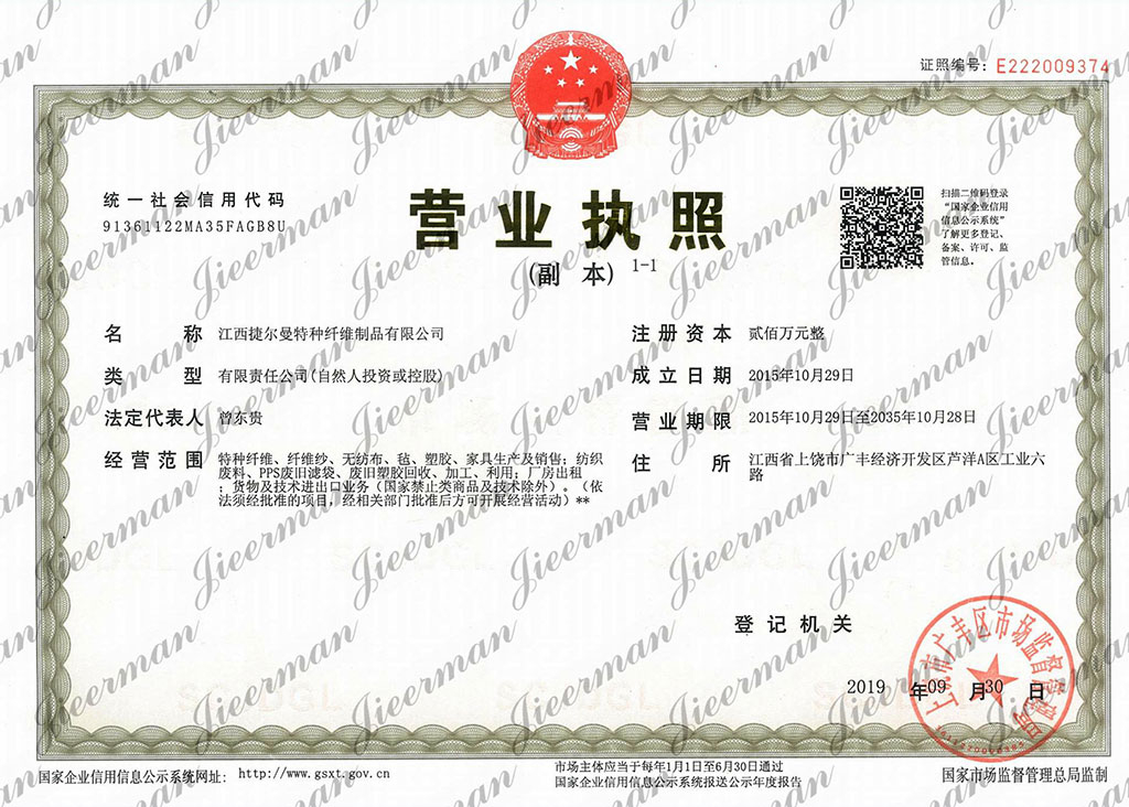 郵寄地址:江西省上饒市廣豐區(qū)廣豐經(jīng)濟開發(fā)區(qū)蘆洋A區(qū)工業(yè)六路 江西捷爾曼特種纖維制品有限公司