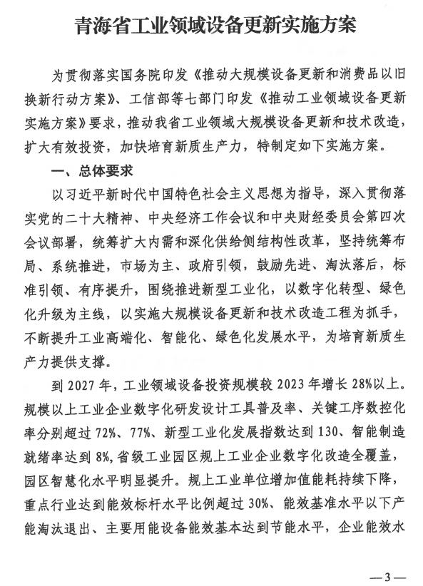 日前,青海省工業(yè)和信息化廳等七部門關(guān)于印發(fā)青海省工業(yè)領(lǐng)域設(shè)備更新實施方案的通知。