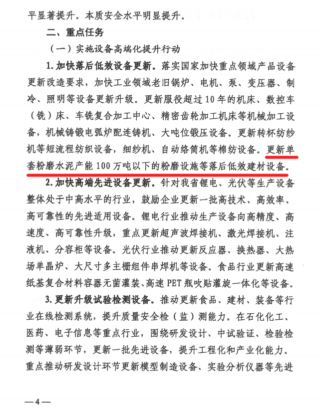青海省工業(yè)領(lǐng)域設(shè)備更新實施方案中提到,加快落后低效設(shè)備更新,更新單套粉磨水泥產(chǎn)能100萬噸以下的粉磨設(shè)施等落后低效建材設(shè)備。