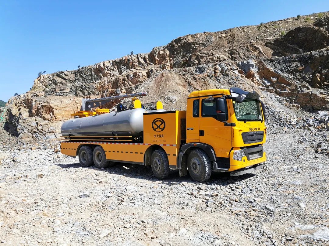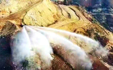由于工程緊鄰南水北調工程干渠,水電八局領導非常重視項目建設過程中的環(huán)境保護,尤其是在山體的開挖過程中,需要采用爆破方式。但在爆破過程中,揚塵的治理一直是行業(yè)內的大難題。如果采用傳統(tǒng)的水袋壓塵,費時費力,效果非常有限,且在填裝炮孔過程中水袋容易劃破,導致內部的水流出,進而影響炮孔的爆破效果;若選用霧炮車壓塵,細微的水霧在巨大的“蘑菇云”面前根本招架不住。通過多次考察,水電八局決定采用交大神舟最先進的“多功能礦山抑塵車”。