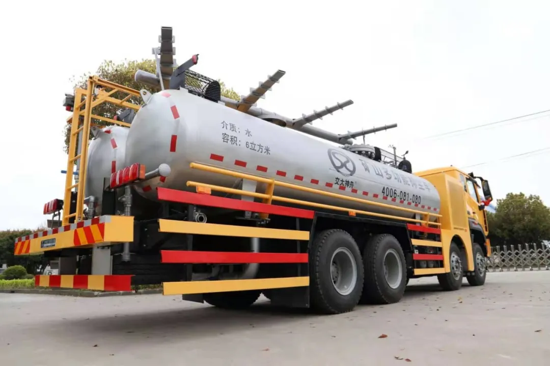 這臺多功能抑塵車是交大神舟又一款拳頭產(chǎn)品,是抑制礦山爆破粉塵的專用裝備,可以抑制爆破瞬間產(chǎn)生的大量揚塵。該車型采用蓄能的原理,利用壓縮空氣的能量,在爆破瞬間以極短時間把10立方的水噴灑向爆破區(qū)域上方,射程高達65米,形成覆蓋面積可達2000平方米的“抑塵罩”。