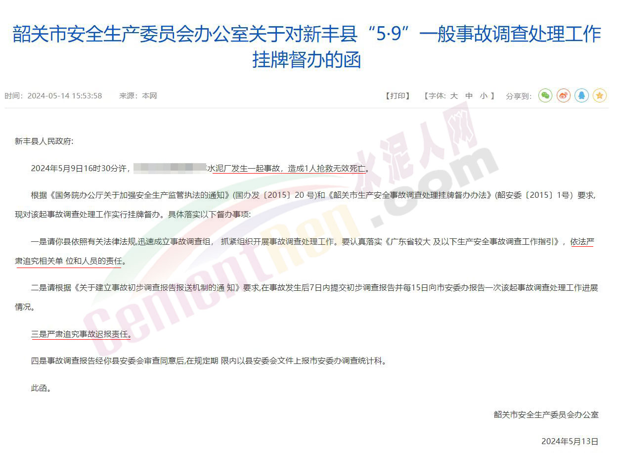 今年5月13日,韶關(guān)市安全生產(chǎn)委員會(huì)辦公室發(fā)布《關(guān)于對(duì)新豐縣“5.9”一般事故調(diào)查處理工作掛牌督辦的函》提到2024年5月9日16時(shí)30分許,韶關(guān)市某水泥廠內(nèi)發(fā)生一起事故,造成1人搶救無效死亡。根據(jù)相關(guān)文件要求,韶關(guān)市對(duì)該起事故調(diào)查處理工作實(shí)行掛牌督辦。并要求嚴(yán)肅追究相關(guān)單位和人員的責(zé)任和事故遲報(bào)責(zé)任。