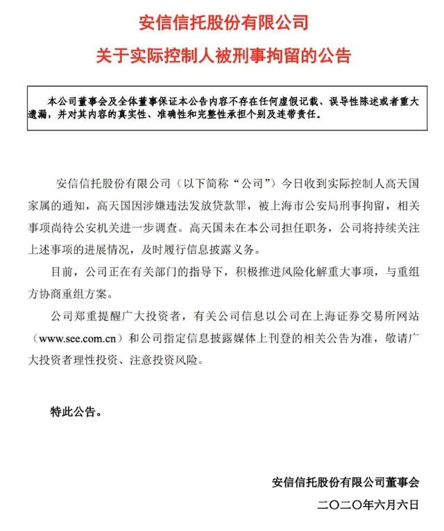 2019年,安信信托多個(gè)項(xiàng)目“爆雷”無法兌付,并被法院列入被執(zhí)行人,訴訟纏身。2020年6月,安信信托公告稱,收到實(shí)際控制人高天國(guó)家屬的通知,高天國(guó)因涉嫌違法發(fā)放貸款罪,被上海市公安局刑事拘留,這也成為三至喜來登酒店走向拍賣的開端。