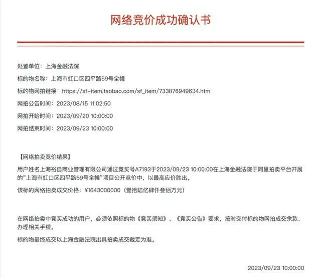 上海金融法院執(zhí)行立案后,于2023年9月23日公開拍賣被執(zhí)行人抵押的全幢酒店即涉案酒店。阿里資產(chǎn)拍賣平臺(tái)顯示,此次拍賣共有18349人圍觀,1人報(bào)名。最終酒店以16.43億元的成交價(jià)被上海裕自商業(yè)管理有限公司拍下。