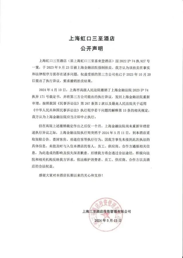 三至酒店微信公眾號(hào)顯示,2024年1月,公眾號(hào)名稱由“上海虹口三至喜來登酒店”認(rèn)證為“上海虹口三至酒店”。5月17日,三至酒店發(fā)布聲明稱,認(rèn)為拍賣在事實(shí)法律程序方面存在諸多問題,權(quán)益受損的第三方公司也提出了執(zhí)行異議,要求撤銷拍賣結(jié)果。