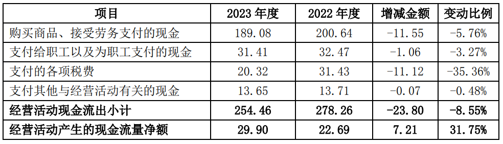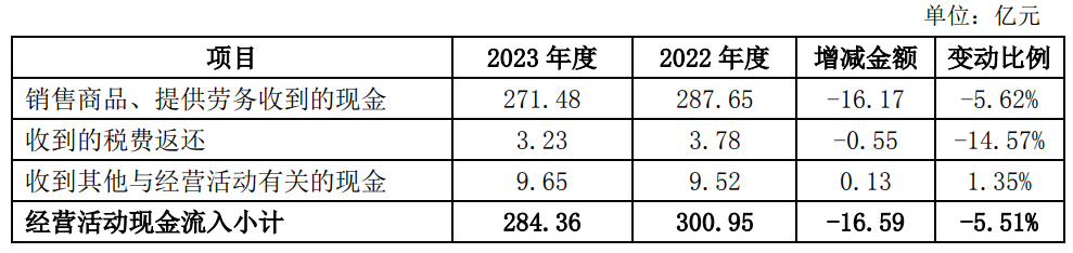 回復(fù):2023年公司實現(xiàn)營業(yè)收入282.35億元,同比下降18.26%;凈利潤-17.48億元,同比下降224.28%;經(jīng)營活動產(chǎn)生的現(xiàn)金流量凈額29.9億元,同比增加31.75%,主要原因為通過持續(xù)推進精細化管理,合理控制存貨庫存,優(yōu)化調(diào)整采購付款節(jié)奏,支付的各項稅費同比減少,進一步減少經(jīng)營資金的支出,使經(jīng)營活動現(xiàn)金流量得到了一定的改善。公司經(jīng)營活動現(xiàn)金流量明細見下表: