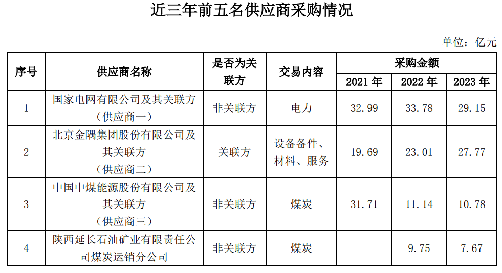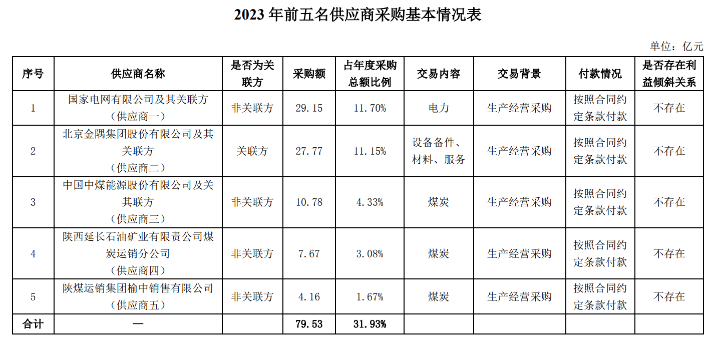 回復(fù):2023年度,前五名供應(yīng)商合計采購金額為79.53億元,占年度采購總額比例為31.93%,其中關(guān)聯(lián)方采購金額為27.77億元,占年度采購總額比例為11.15%。與關(guān)聯(lián)方發(fā)生的采購主要為采購機械設(shè)備及備件、設(shè)備維修服務(wù)等,所發(fā)生的關(guān)聯(lián)交易均履行了必要的審議程序及信息披露義務(wù),且實際發(fā)生的交易金額均在公司董事會及股東大會批準的額度內(nèi),不存在利益傾斜情形。前五名供應(yīng)商的基本情況見下表: