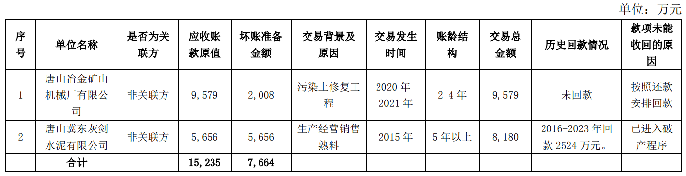 截至2023年12月31日,公司1年以上應(yīng)收賬款余額12.64億元,占應(yīng)收賬款總額的44.1%,占營業(yè)收入的4.5%,主要涉及水泥銷售、危廢固廢處置等業(yè)務(wù)。水泥業(yè)務(wù)1年以上應(yīng)收賬款主要為國家的“鐵、公、機”等大型基礎(chǔ)建設(shè)項目的施工單位,客戶群體主要為央企國企,水泥用量大且施工周期長,貨款結(jié)算周期長,資金風險可控。危廢固廢處置業(yè)務(wù)1年以上應(yīng)收賬款主要為應(yīng)收政府款項,由于各地財政資金緊張,尚未回款,公司對應(yīng)收政府款項制定清理方案,積極與政府進行溝通。