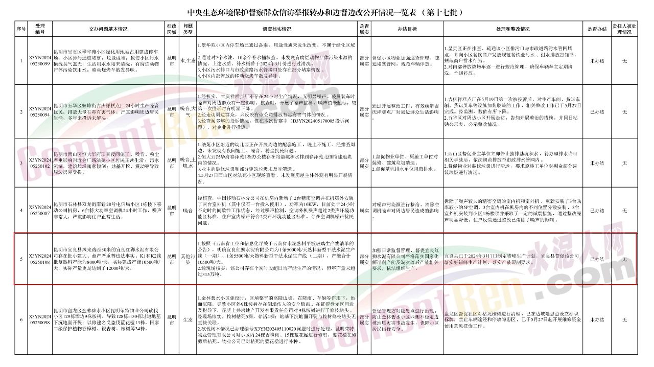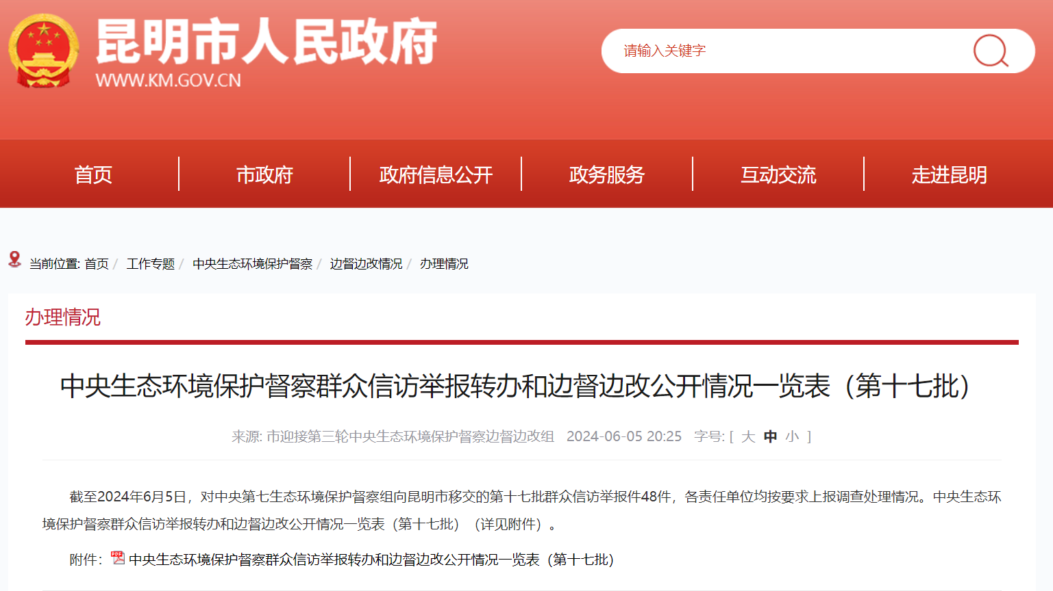 昆明市政府官網(wǎng)2024年6月5日消息:截至2024年6月5日,對(duì)中央第七生態(tài)環(huán)境保護(hù)督察組向昆明市移交的第十七批群眾信訪(fǎng)舉報(bào)件48件,各責(zé)任單位均按要求上報(bào)調(diào)查處理情況。以下為中央生態(tài)環(huán)境保護(hù)督察群眾信訪(fǎng)舉報(bào)轉(zhuǎn)辦和邊督邊改公開(kāi)情況一覽表(第十七批)。