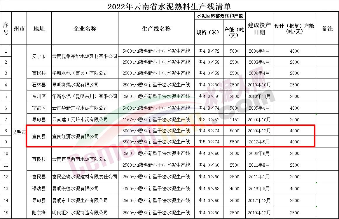 按照《云南省工業(yè)和信息化廳關(guān)于云南省水泥熟料平板玻璃生產(chǎn)線(xiàn)清單的公告》,明確宜良紅獅水泥有限公司為1條5000噸/天熟料新型干法水泥生產(chǎn)線(xiàn)(一期)、1條5500噸/天熟料新型干法水泥生產(chǎn)線(xiàn)(二期),產(chǎn)能合計(jì)10500噸/天。