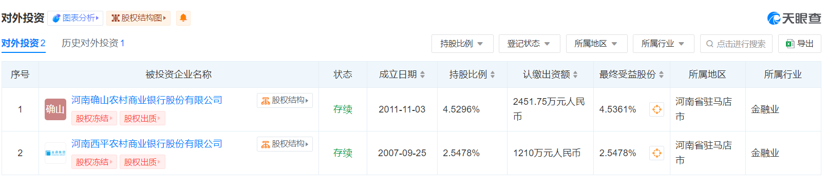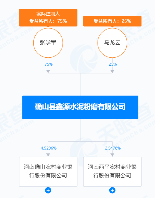 公開信息顯示,確山縣鑫源水泥粉磨有限公司持股兩家銀行,分別河南確山農(nóng)村商業(yè)銀行股份有限公司4.5296%股權(quán)、河南西平農(nóng)村商業(yè)銀行股份有限公司2.5478%。