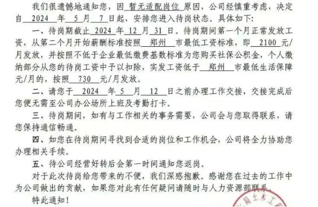 某央企旗下土木公司發(fā)布通知,對于暫無適崗位的員工全部進入待崗狀態(tài),待崗期間第一個月正常發(fā)放工資,從第二個月開始,按照鄭州市最低工資標準,即2100元/月發(fā)放,并按照不低于企業(yè)最低繳費基數(shù)標準購買社保金積金,實發(fā)工資低鄭州市最低生活保障的,按照730元/月發(fā)放。