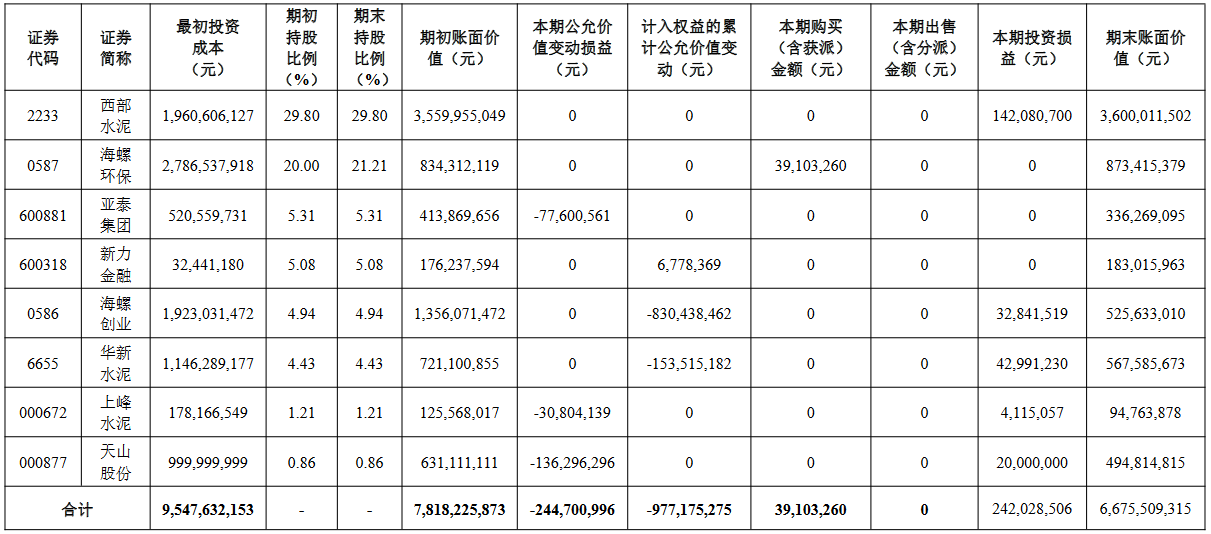 從投資的企業(yè)來看,僅西部水泥和新力金融屬于正收益,總收益17.9億元,而投資的海螺環(huán)保、亞泰集團(tuán)、海螺創(chuàng)業(yè)、華新水泥、上峰水泥、天山股份累計(jì)虧損46.52億元。