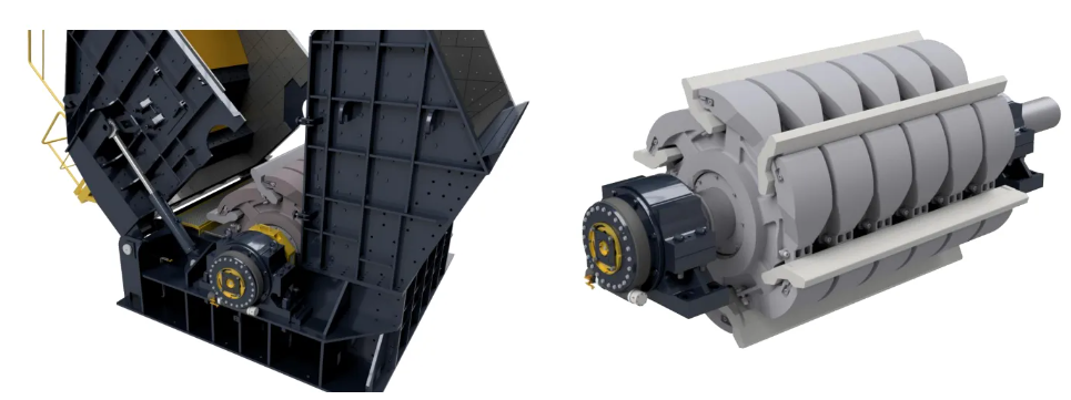 HPI破碎機(jī)有兩個(gè)反擊板,也可以配備研磨架。轉(zhuǎn)子能夠處理高達(dá)3m³的進(jìn)料,研磨路徑限制了超大產(chǎn)品的數(shù)量。反擊板和磨削架的間隙設(shè)置可以通過(guò)主軸進(jìn)行調(diào)整,也可以通過(guò)液壓控制,并允許對(duì)最終產(chǎn)品的粒度進(jìn)行最佳控制。其中,轉(zhuǎn)子是破碎過(guò)程中的關(guān)鍵部件。其主體與軸和軸承一起構(gòu)成了反擊式破碎機(jī)的“心臟”。