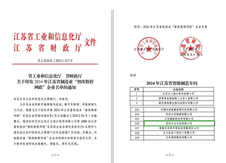 近日,江蘇省工業(yè)和信息化廳公布了2024年智能制造和數(shù)字化車間名單,蘇州天山水泥有限公司(以下簡(jiǎn)稱“天山水泥”榜上有名,榮獲江蘇省“智能制造車間”稱號(hào)。