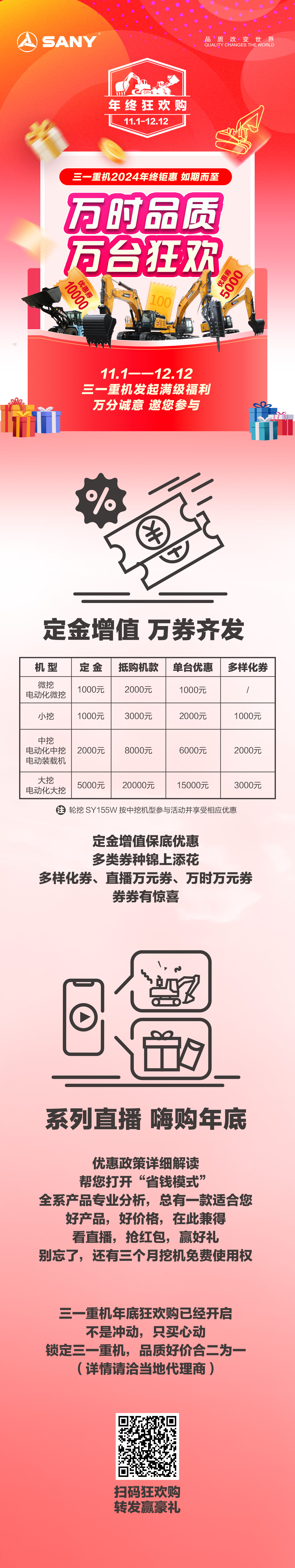 萬時(shí)品質(zhì),萬臺狂歡,三一重機(jī)年終鉅惠,滿級福利震撼來襲!