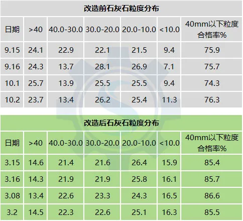 改造前后石灰石粒度分布對(duì)比