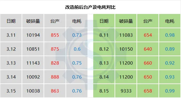 破碎機(jī)錘頭也由原來(lái)的50個(gè)減少至16個(gè),大大降低了錘頭損耗量;轉(zhuǎn)子工作直徑從2米增大到2.2米,打擊面也擴(kuò)大了;改造前破碎機(jī)只有下方出料,現(xiàn)在是前后都出料,增加了物料通過(guò)能力。經(jīng)過(guò)技術(shù)改造后,不僅提高了臺(tái)產(chǎn),在增大電機(jī)的情況下依然降低了電耗,而且實(shí)現(xiàn)了水泥骨料共產(chǎn)。