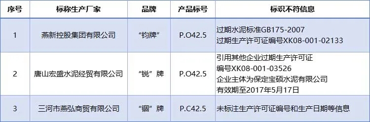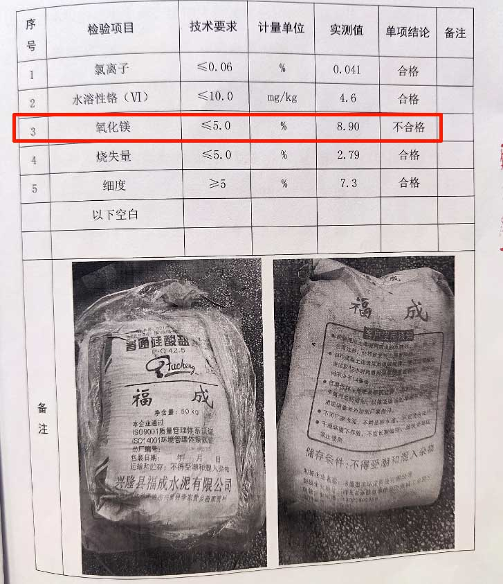 同期發(fā)現(xiàn)的標稱為興隆縣福成水泥有限公司生產(chǎn)的“福成”牌P.C42.5水泥一批次細度和氧化鎂項目與標準要求不符。