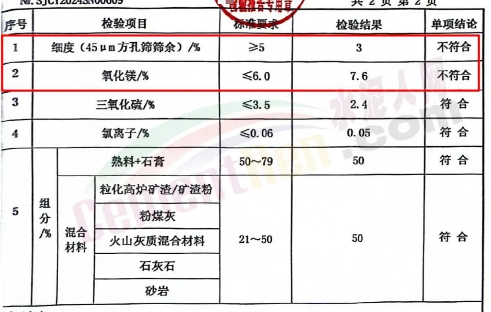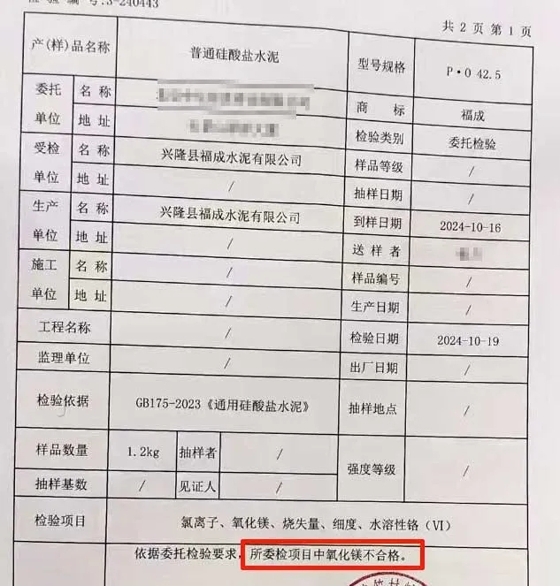 標稱生產(chǎn)企業(yè)為興隆縣福成水泥有限公司生產(chǎn)的一批次福成牌P.O42.5水泥,氧化鎂項目不合格。