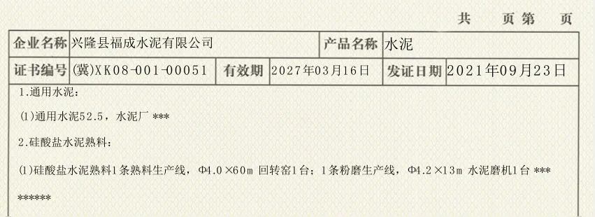 從公開信息可見,興隆縣福成水泥有限公司企業(yè)類型為全能水泥廠。許可產(chǎn)品為通用水泥及硅酸鹽水泥熟料;企業(yè)擁有1條熟料生產(chǎn)線和1條粉磨生產(chǎn)線,關(guān)鍵設(shè)備為Ф4.0*60m回轉(zhuǎn)窯1臺,4.2*13m水泥磨機1臺;