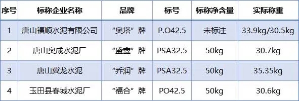 凈含量與標準要求不符的水泥產(chǎn)品4個批次