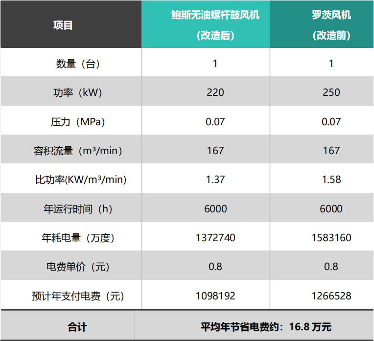 1、優(yōu)化鼓風機選型:根據(jù)客戶提供的壓力及額定流量,選定1臺220KW的螺桿鼓風機替換原有的1臺250KW的羅茨風機,一定程度上減少采購運行成本。